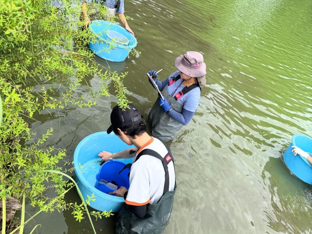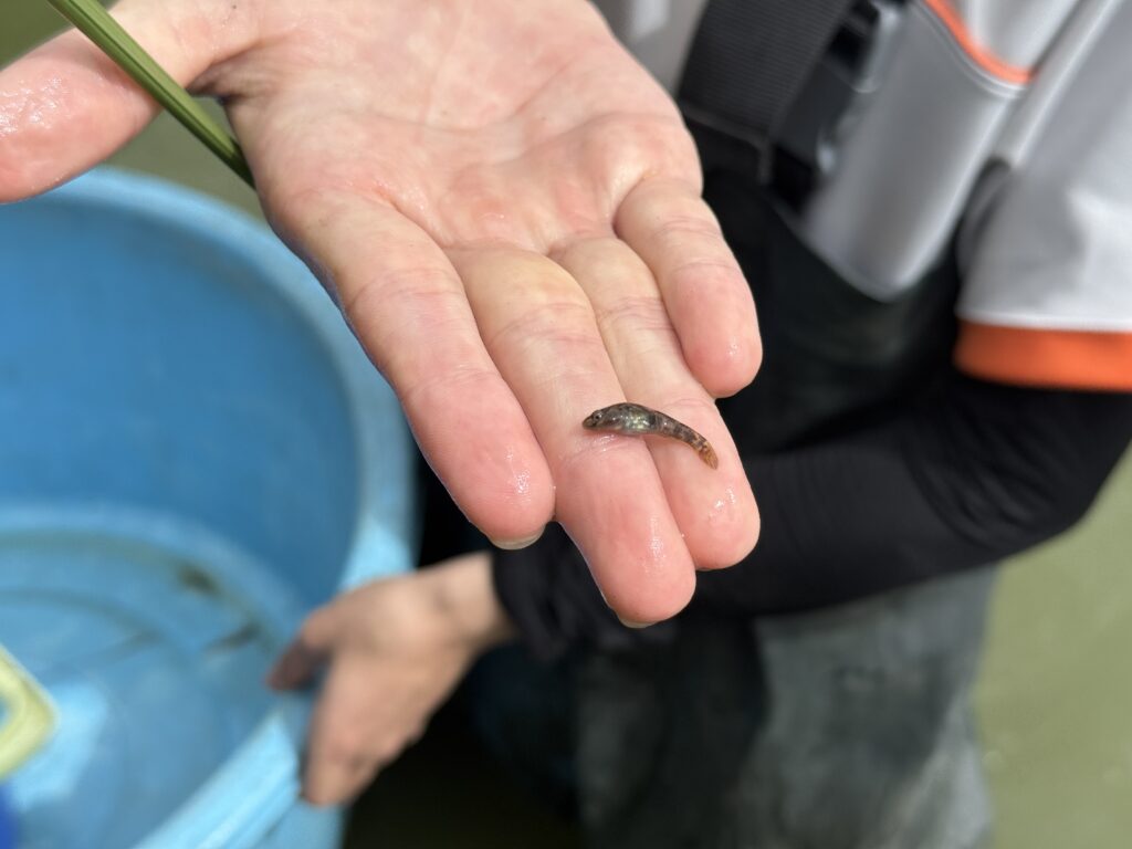 池に仕掛けた罠をまわりながらアメリカザリガニやウシガエル(おたまじゃくし)といった外来種と在来種を選別、数を集計しました。主な在来種はモツゴ、銀フナ、スジエビ、ヨシノボリなどがいました。