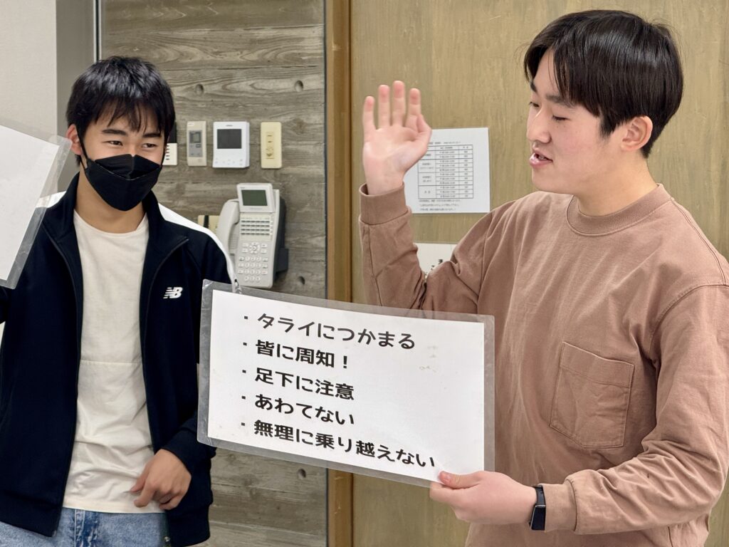 その前に、作業中の安全意識向上のために注意すべき事項を皆で共有するKY(危険予知)について発表しました。建設現場などでも取り入れられている大切なオペレーションの1つです。