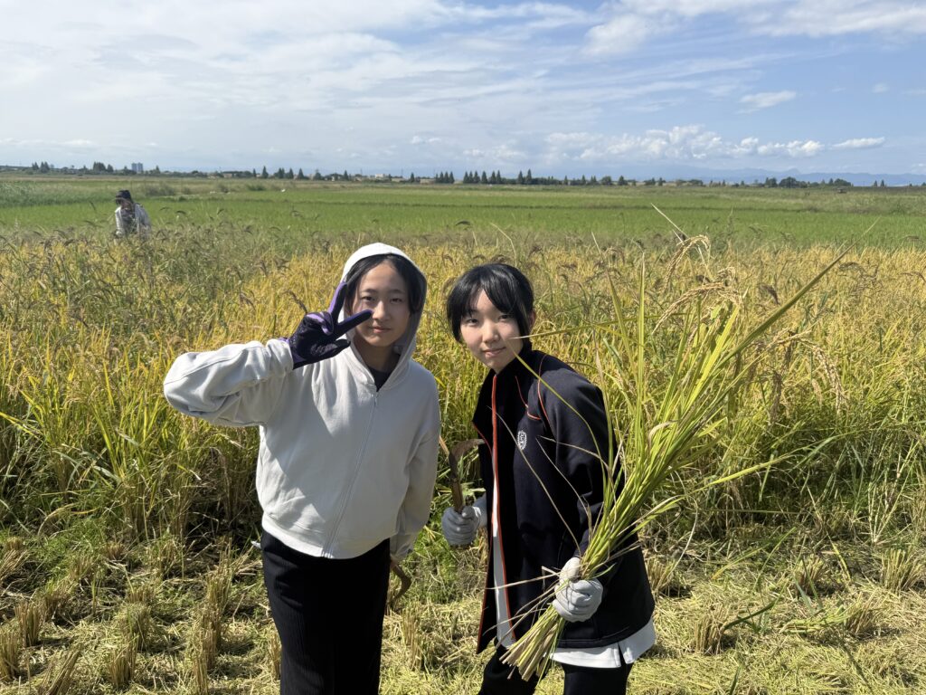 米部会さんから鎌の使い方を教えていただき、それぞれペアになって収穫を行いました。