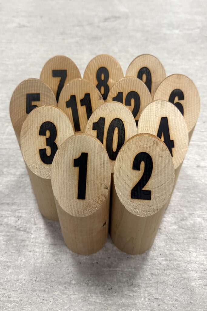 これがスキットルといわれる的になります。この中の一本だけを倒した場合は書いてある数字が、複数本倒した場合には倒した本数がスコアとして計上されていきます。合計が50ぴったりにできれば勝利、超えた場合には25からやり直して、先に50にできたチームが勝利になります。